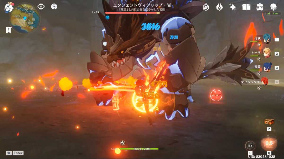 終始,エンシェントヴィシャップの下地元素が水になっていると思います.生半可な元素反応の量ではこの下地元素を剥がすことができません.これが行秋が強い理由の一つなわけですが,なぜそこまで付着が強いのか解説します.