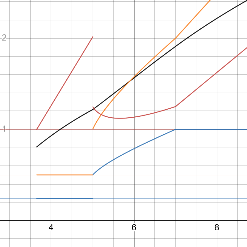 赤が攻撃力で青が会心率,橙が会心ダメージです.黒は期待値の自然対数です.